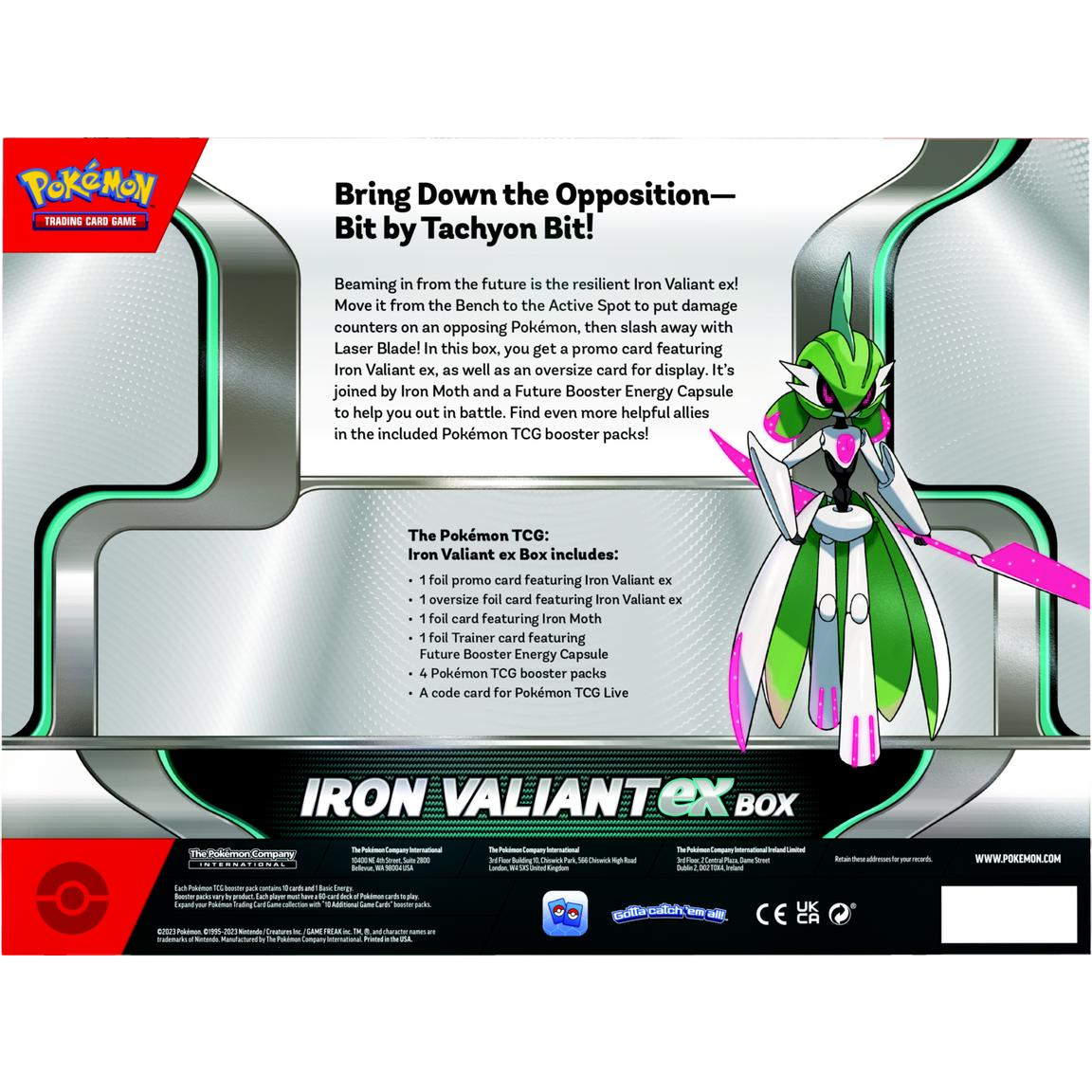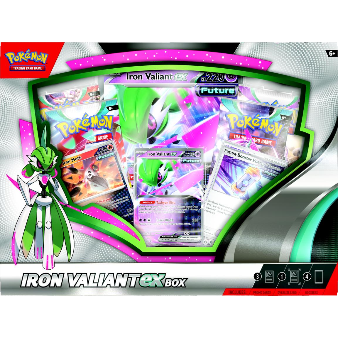 Bit by Tachyon Bit—a Calamity Storm is Coming! Awakening from a long-gone world is the ferocious Roaring Moon ex—while the resilient Iron Valiant ex beams in from the future! In this box, you get apromo card and an oversize card featuring either Roaring Moon ex or Iron Valiant ex. Roaring Moon ex is joined by Brute Bonnet and an Ancient Booster Energy Capsule, and Iron Valiant ex comes with Iron Moth and a Future Booster Energy Capsule—all things that your past self would want you to have to help you out in the future. Find even more helpful allies in the included Pokémon TCG booster packs!
