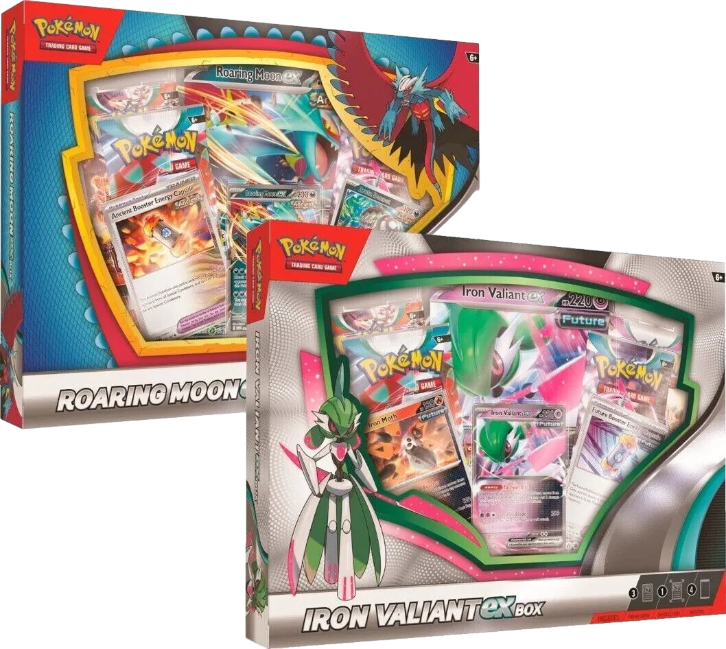Each Pokémon TCG: Roaring Moon ex Box or Iron Valiant ex Box includes: