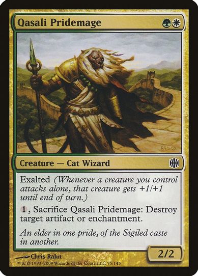 Description: Exalted (Whenever a creature you control attacks alone, that creature gets +1/+1 until end of turn.) {1}, Sacrifice Qasali Pridemage: Destroy target artifact or enchantment.