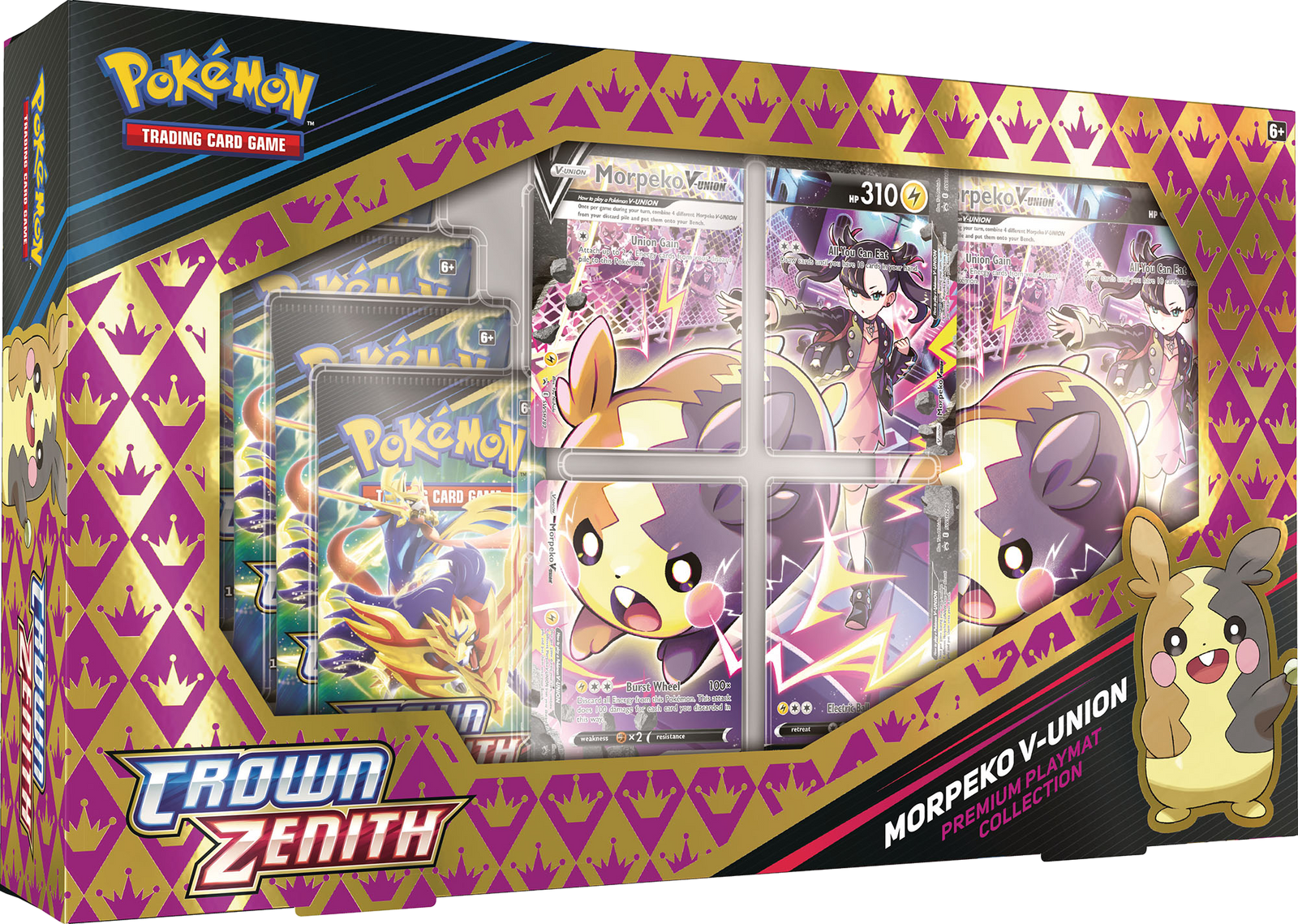 Includes five Crown Zenith booster packs, four Morpeko V-UNION cards, one Professor Burnet card, one playmat and one oversize card