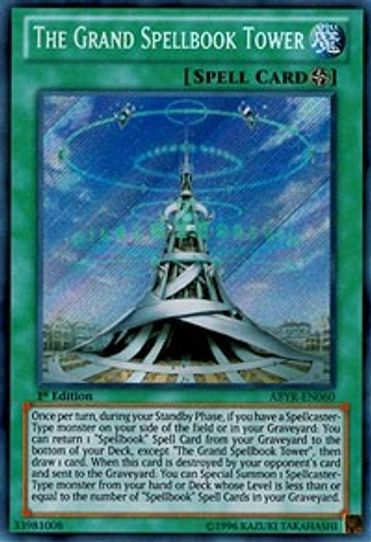 Description: Once per turn, during your Standby Phase, if you have a Spellcaster-Type monster on your side of the field or in your Graveyard: You can return 1 "Spellbook" Spell Card from your Graveyard to the bottom of your Deck, except "The Grand Spellbook Tower", then draw 1 card. When this card is destroyed by your opponent's card and sent to the Graveyard: You can Special Summon 1 Spellcaster-Type monster from your hand or Deck whose Level is less than or equal to the number of "Spellbook" Spell Cards in your Graveyard.