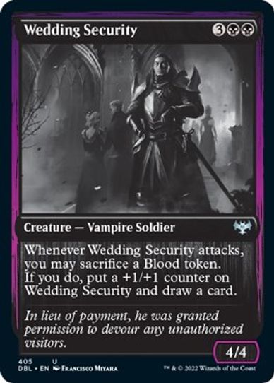 Description: Whenever Wedding Security attacks, you may sacrifice a Blood token. If you do, put a +1/+1 counter on Wedding Security and draw a card.
