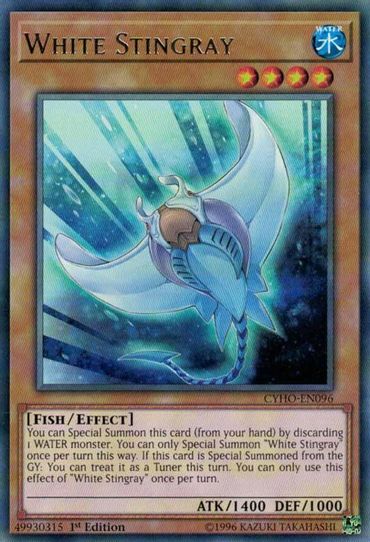Description: You can Special Summon this card (from your hand) by discarding 1 WATER monster. You can only Special Summon "White Stingray" once per turn this way. If this card is Special Summoned from the GY: You can treat it as a Tuner this turn. You can only use this effect of "White Stingray" once per turn.