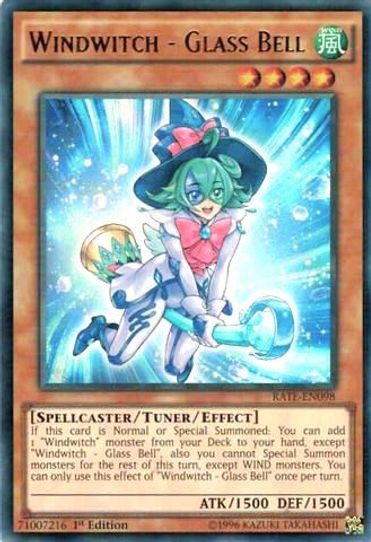 Description: If this card is Normal or Special Summoned: You can add 1 "Windwitch" monster from your Deck to your hand, except "Windwitch - Glass Bell", also you cannot Special Summon monsters for the rest of this turn, except WIND monsters. You can only use this effect of "Windwitch - Glass Bell" once per turn.