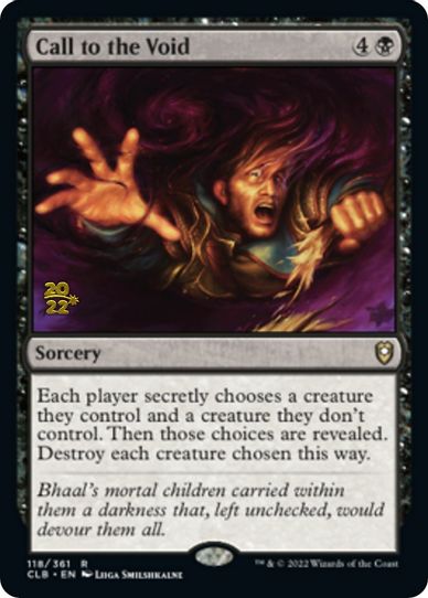 Description: Each player secretly chooses a creature they control and a creature they don't control. Then those choices are revealed. Destroy each creature chosen this way.