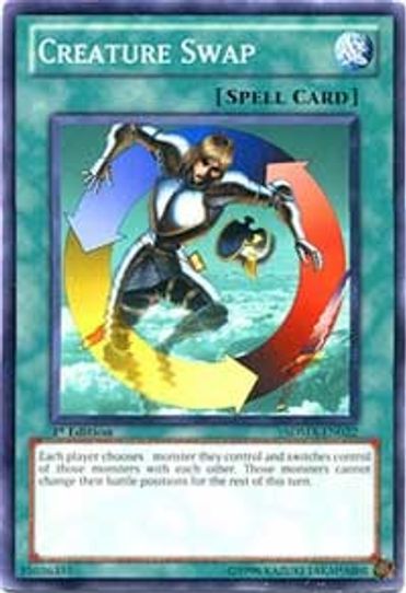 Description: Each player selects 1 monster they control and switches control of those monsters with each other. Those monsters cannot change their battle positions for the rest of this turn.