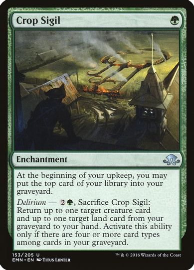 Delirium — 2G, Sacrifice Crop Sigil: Return up to one target creature card and up to one target land card from your graveyard to your hand. Activate this ability only if there are four or more card types among cards in your graveyard.