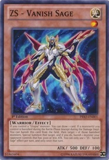 Description: If you control a "Utopia" monster: You can draw 1 card. If a monster(s) you control is banished during the Battle Phase (except during the Damage Step): You can banish this card from the field, then target 1 of those banished monsters; Special Summon that target, and if you do, banish 1 monster your opponent controls that has 3000 or less ATK. You can only use 1 "ZS - Vanish Sage" effect per turn, and only once that turn.